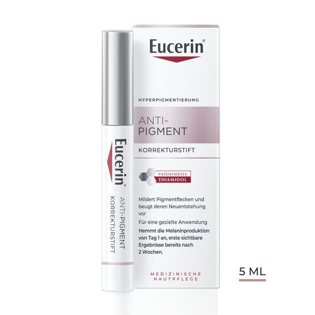 Eucerin® Anti-Pigment Korrekturstift ist ein nicht fettendes Gel mit einem Applikator, mit dem es sich leicht und präzise auf kleine Bereiche mit Hyperpigmentierung auftragen lässt. Es enthält Thiamidol®, einen wirksamen und patentierten Wirkstoff, der an der Ursache der Hyperpigmentierung ansetzt, indem er die Melaninproduktion vom ersten Tag an reduziert und bei regelmäßiger Anwendung bereits nach 2 Wochen erste sichtbare Ergebnisse zeigt. Es ist klinisch und dermatologisch erwiesen, dass es alle Arten von dunklen Flecken reduziert und ihr erneutes Auftreten verhindert.