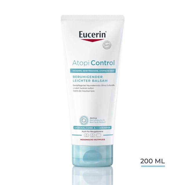 Der parfümfreie Balsam hat eine leichte, angenehme Textur, die schnell einzieht, nicht fettet und nicht klebt. Eucerin AtopiControl Beruhigender Balsam ist dermatologisch getestet für trockene, atopische Haut. Er kann vom ersten Tag an sicher für die empfindliche Haut von Neugeborenen und Babys verwendet werden, im Windelbereich erst nach dem ersten Monat. Dank der sensiblen und dennoch wirksamen Formel ist er auch ideal für Kinder und Erwachsene, also ein Balsam für die ganze Familie, der die Hautbarriere bewahrt und juckende Haut aktiv beruhigt.