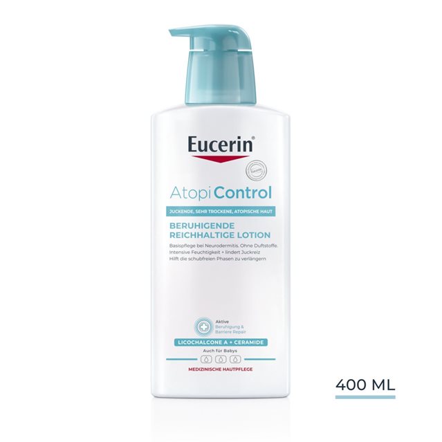 Eucerin AtopiControl Reichhaltige Beruhigende Lotion ist eine spezielle Lotion für die tägliche Anwendung bei Ekzemen, die gereizte und juckende Haut beruhigt und ihr intensiv Feuchtigkeit spendet. Die leicht einziehende Wasser-in-Öl-Lotion ist mit beruhigendem Licochalcone A, Ceramiden und Omega-Ölen angereichert, um die Hautbarriere zu stärken, Trockenheit und Juckreiz zu lindern und die Zeit zwischen den Schüben bei Neurodermitis zu verlängern. Bei regelmäßiger Anwendung verbessert sich der Hautzustand spürbar und die Haut fühlt sich weich und geschmeidig an.