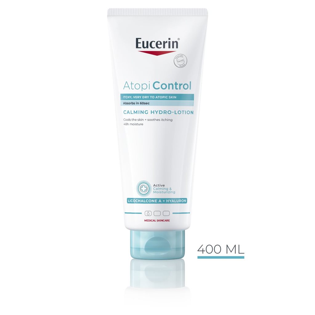 Eucerin AtopiControl Beruhigende Hydro-Lotion ist eine täglich anwendbare Körperpflege, die speziell entwickelt wurde, um gereizte und juckende Haut zu beruhigen und intensiv mit Feuchtigkeit zu versorgen. Die Kombination aus Licochalcone A, Hyaluronsäure und Ceramiden bietet eine schnell wirkende Linderung, beruhigt juckende, zu Ekzemen neigende Haut und sorgt für lang anhaltenden Hautkomfort. Bei regelmäßiger Anwendung verbessert sich der Hautzustand spürbar, die Haut wird weicher und fühlt sich geschmeidiger an.