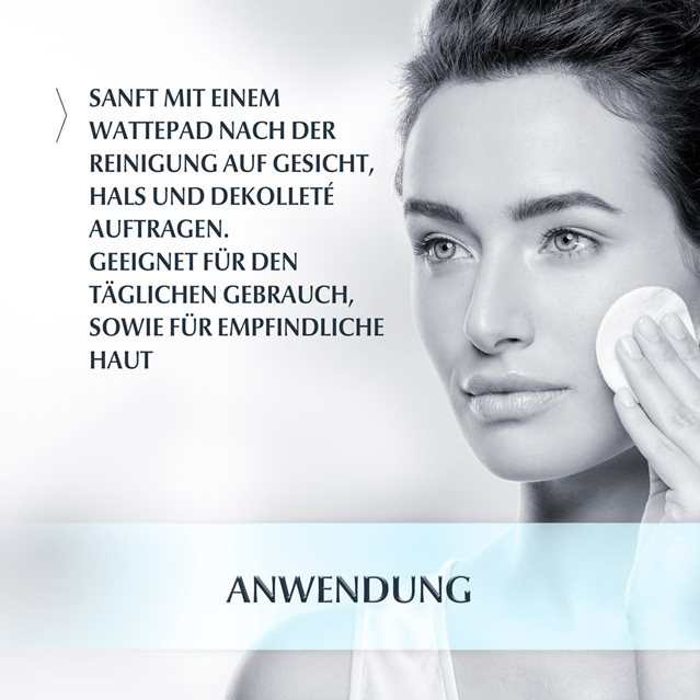 Sanft mit einem Wattepad nach der Reinigung auf Gesicht, Hals und Dekolleté auftragen.