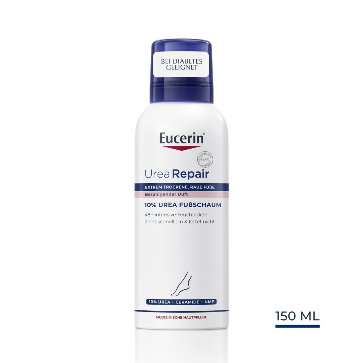 Eucerin UreaRepair 10% Urea Fußcreme und Eucerin UreaRepair 10% Urea Fußschaum haben die gleichen wirksamen Inhaltsstoffe, doch der Eucerin UreaRepair 10% Urea Fußschaum weist einige wichtige Unterschiede auf. Er hat einen parfümierten Duft, eine schaumige Textur und wird im Sprühformat geliefert, was ein anderes Anwendungserlebnis als bei einer Creme ermöglicht. Außerdem zieht er schnell ein, klebt nicht und fettet nicht.
